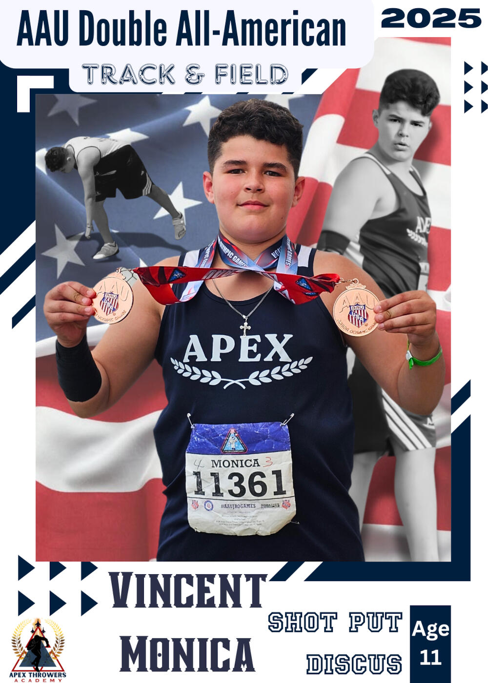 Vincent Monica is an 11-year-old thrower from Mountlake Terrace, WA—competing unattached, coached by his father, and powered by a family-led system built on grit, precision, and verified achievement.In 2025, Vincent earned All-American honors in both shot put and discus at the AAU Junior Olympics. He holds Top-10 national marks in both events—without a club, without district funding, and without institutional backing.Every throw is earned. Every milestone is documented. Every moment is part of a legacy.This is Apex Throwers Academy.